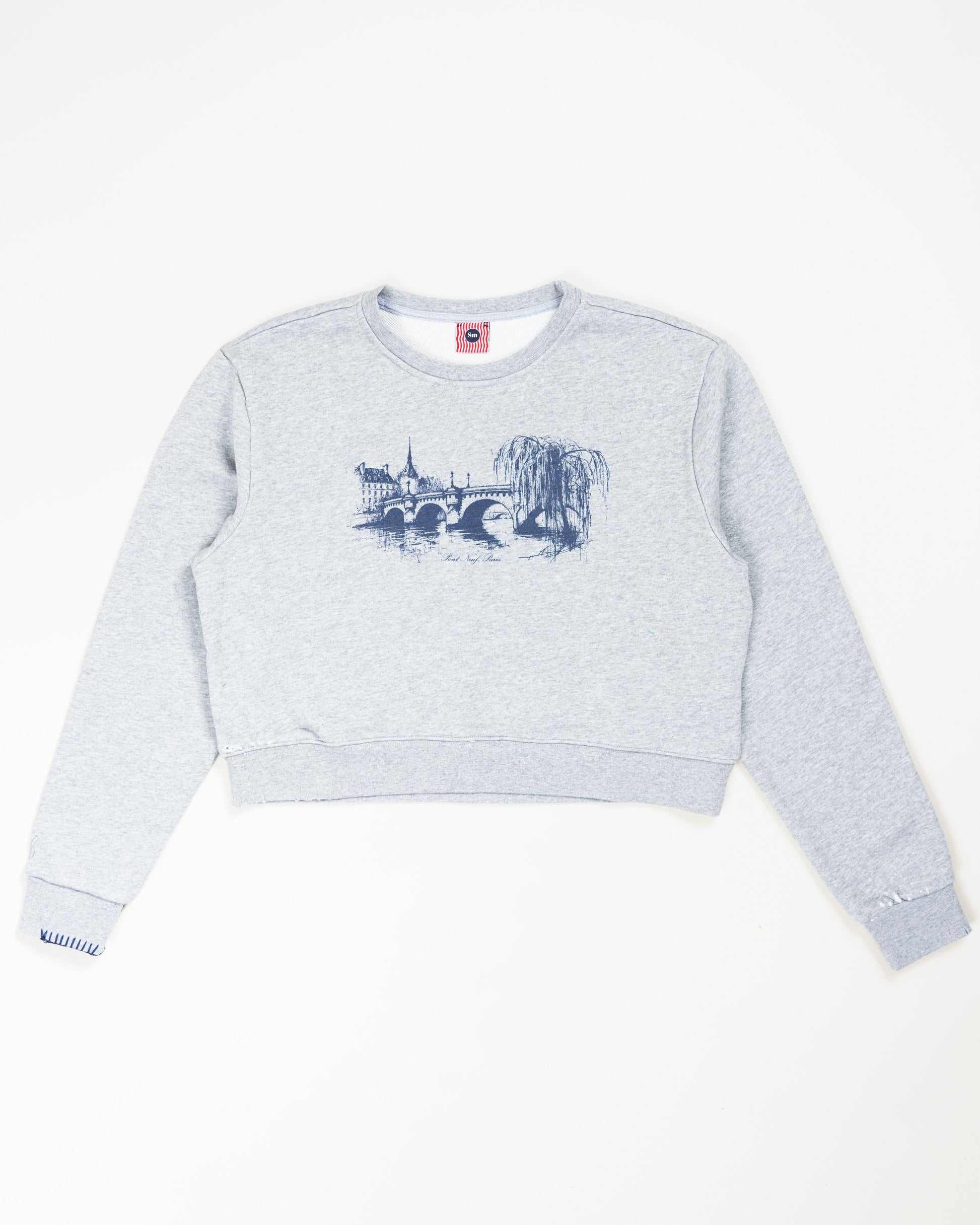 This 100% cotton crewneck features our custom Pont-Neuf screen print, a cropped fit, a vintage-inspired wash, and custom embroidery along the cuff seam.